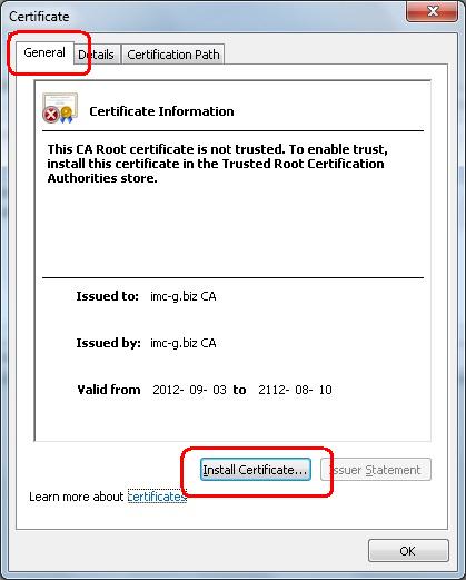Please select the "General" tab, and then click the "Install Certificate.." button.