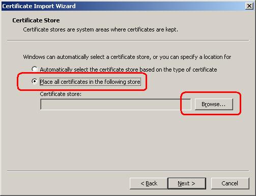 Select the "Place all certificates in the following store" option, and then click the "Browse.." button.