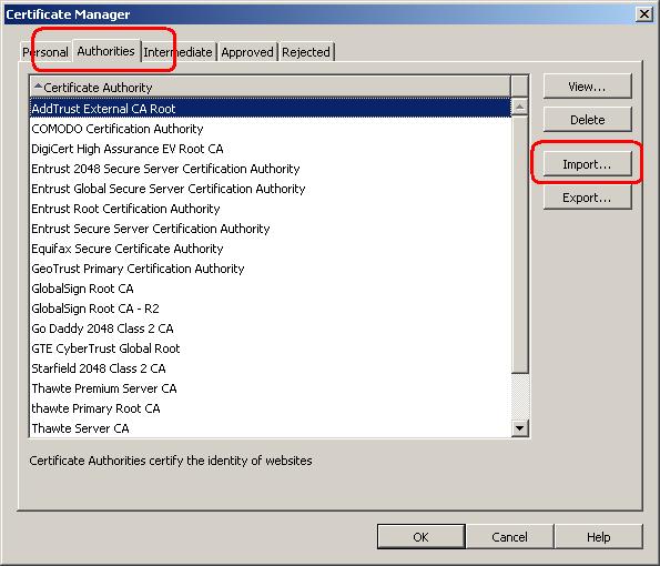 In "Certificate Manager" window, please select the "Authorities" tab, and them press the "Import..." button.