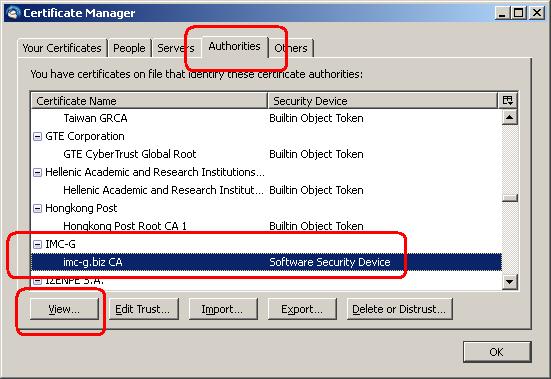 In the "Authorities" tab, please locate the "imc-g.biz CA" certificate. Please select this certificate, and then press the "View..." button.