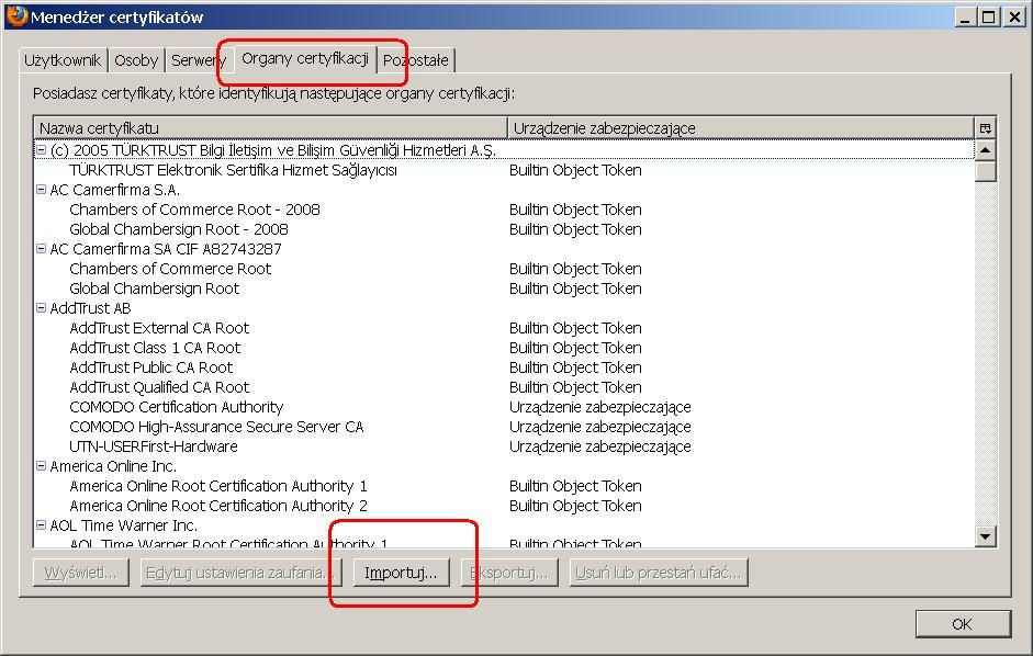 Wybranie przycisku "Wyświetl certyfikaty" otwiera okno "Menedżer certyfikatów". W tym oknie proszę wybrać zakładkę "Organy certyfikacji" a następnie wcisnąć przycisk "Importuj...":