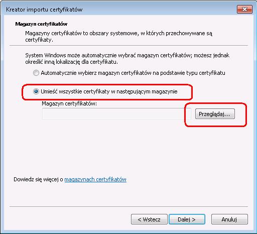 Na kolejnym ekranie proszę zaznaczyć "Umieść wszystkie certyfikaty w następującym magazynie", a następnie proszę wybrać przycisk "Przeglądaj".