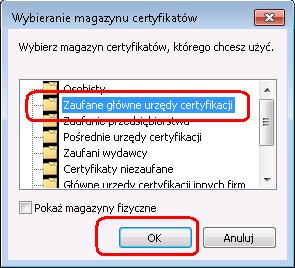 Proszę wskazać magazyn "Zaufane główne urzędy certyfikacji", i zatwierdzić wybór przyciskiem "OK"