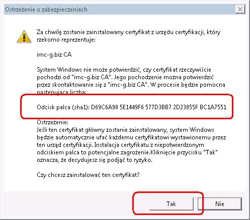 Na ekranie "Ostrzeżenie o zabezpieczeniach" proszę zwrócić uwagę, czy wyświetlany jest odcisk palca sha1 o wartości
