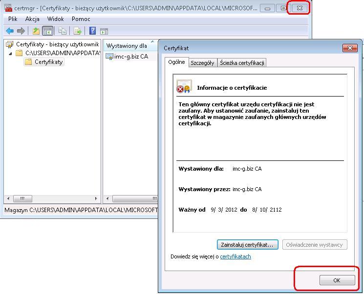 Proszę pozamykać okna, pozostałe po imporcie certyfikatu.