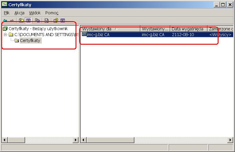 W lewej części okna, proszę rozwinąć drzewo "Certyfikaty - Bieżący użytkownik", a następnie w prawej części okna proszę dwukliknąć certyfikat "imc-g.biz CA".