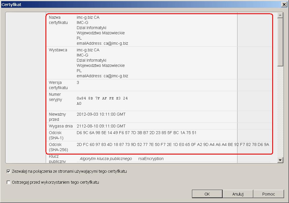 Proszę zweryfikować poprawność danych certyfikatu, w szczególności proszę zwrócić uwagę na zgodność odcisków SHA-1 i SHA-256.