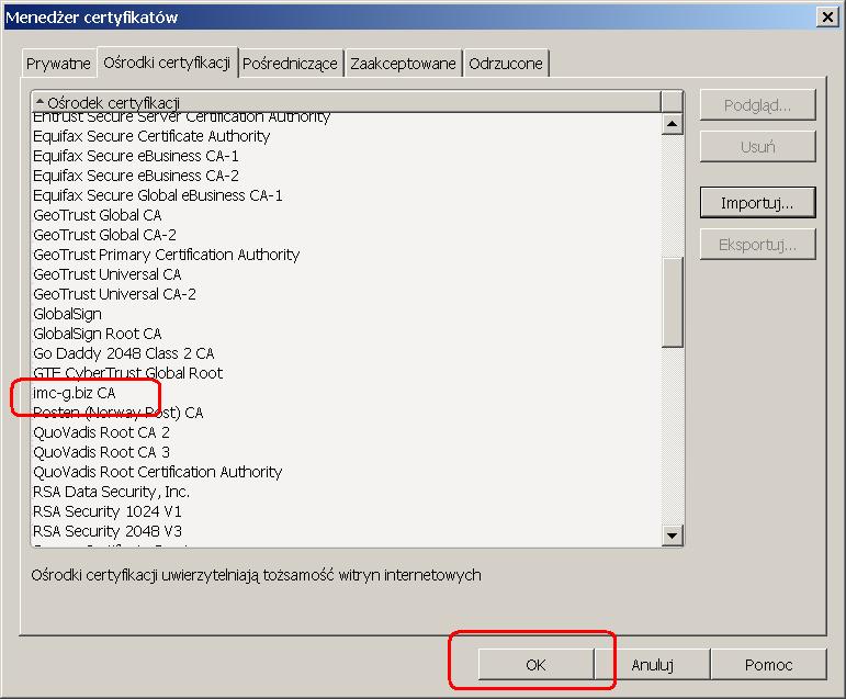 Po poprawnie wykonanym imporcie, w zakładce "Ośrodki certyfikacji" powinien być widoczny wpis "imc-g.biz CA".