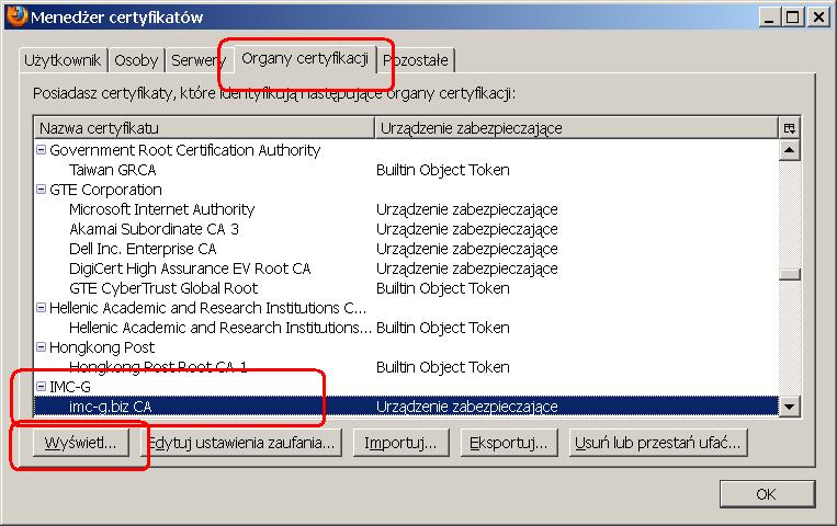 W oknie "Menedżera certyfikatów", na zakładce "Organy certyfikacji", pod hasłem "IMC-G", powinien pojawić się nowy certyfikat. Proszę go zaznaczyć a następnie wybrać przycisk "Wyświetl":