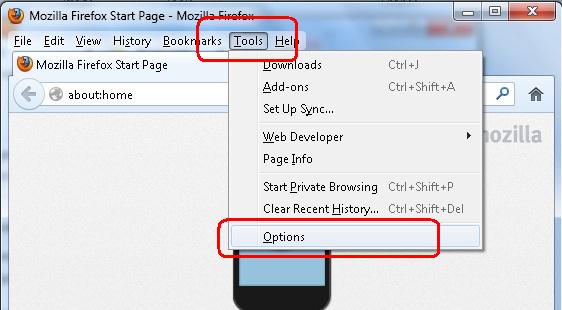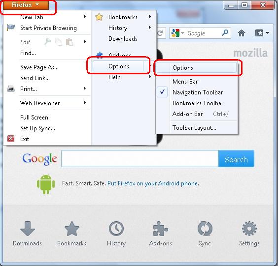 If the top menu bar is hidden, please expand the orange "Firefox" button, then select "Options", and again "Options".