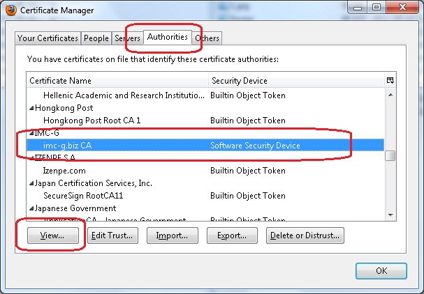 On the "Authorities" tab, please find the "imc-g.biz CA" certificate, and then press the "View" button.