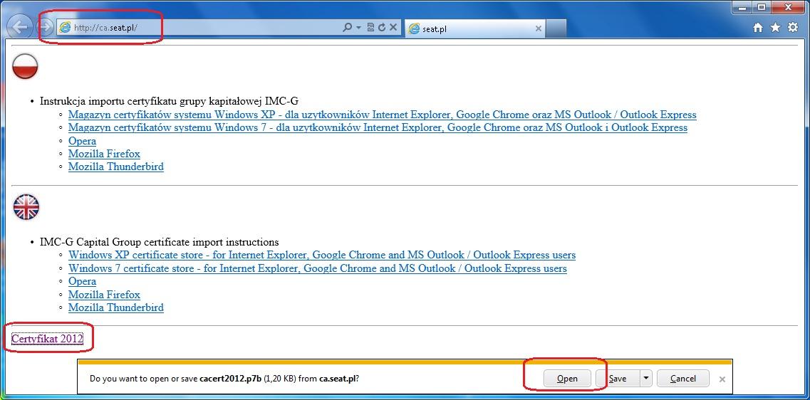 link do certificate. Then press the "Open" button to initiate certificate import procedure.
