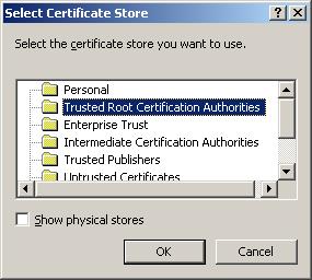 Please select the "Trusted Root Certification Authorities" certificate store, and then press "OK"