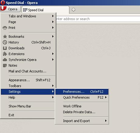 Please start the Opera web browser, and from the "Opera" menu choose "Settings", and then "Preferences".