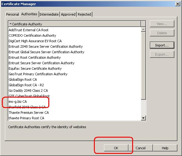 If the certificate has been imported correctly, on the "Authorities" tab you should be able to find "imc-g.biz CA" entry.