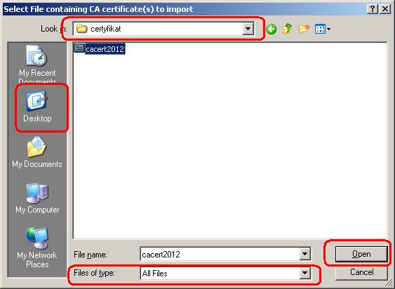 In the file selector window, select "All files" from the "Files of type" pull down list. Then press the "Desktop" icon. In the right pane locate and double click the "certyfikat" folder. Select cacert2012.p7b certificate file, and press "Open" button.