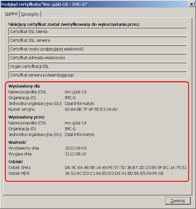 Proszę upewnić się, że dane certyfikatu, wyświetlane w Państwa przeglądarce, są zgodnie z poniższymi:
