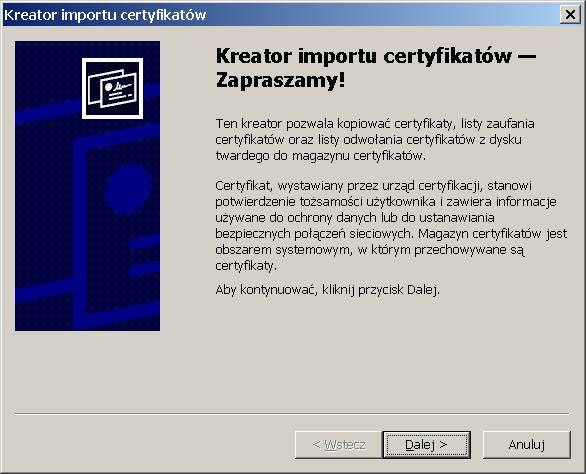 W oknie "Kreator importu certyfikatów" proszę wybrać przycisk "Dalej >"