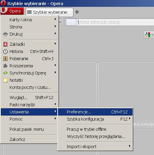 Proszę uruchomić program Opera, a następnie z menu "Opera" proszę wybrać pozycję "Ustawienia", a następnie "Preferencje":