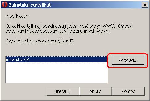 W oknie zatytyłowanym "Zainstaluj certyfikat" proszę wybrać przycisk "Podgląd..."